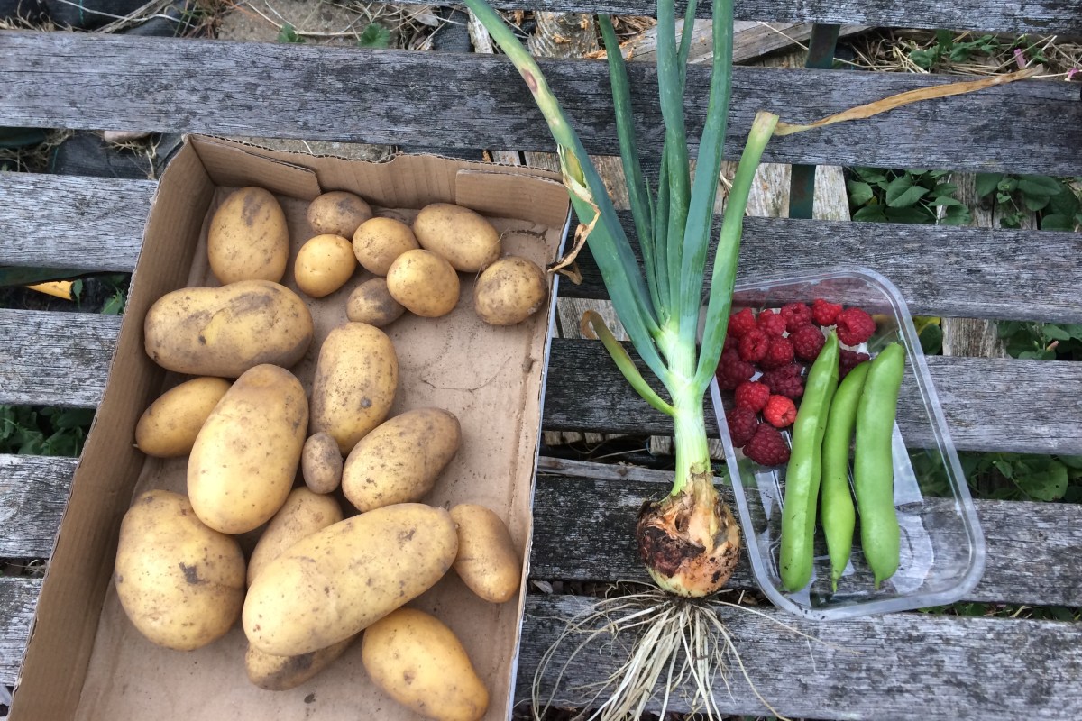 I pulled an onion up because I was dying to try it, but I’ll try to leave the others in a bit longer; some are a reasonable size, some are still pretty small. The potatoes are doing well. I’ve pulled most of the Charlottes, as the leaves succumbed to a bit of blight, so I’ve dug up those potatoes now. The International Kidneys are still in the ground and will keep me in tatties for a while.